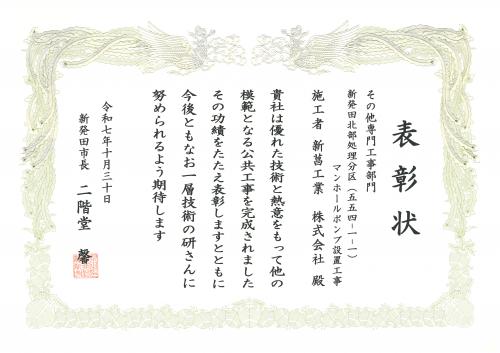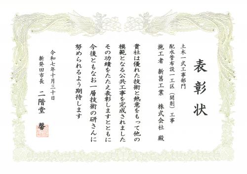 これは新発田市発注の公共工事において、その技術が優れ、模範となる工事について表彰されたものであります。